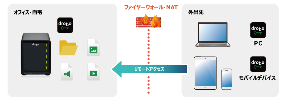 外出先から自宅やオフィスにあるDrobo※1へリモートアクセスが可能になるDroboの拡張機能です。ファイヤーウォールやルーターが設置されていても、難しいネットワーク設定を変更することなくリモートアクセス可能に。また通信はSSL※2で暗号化されるため、他人にデータを読み取られる心配がなく、安心です。