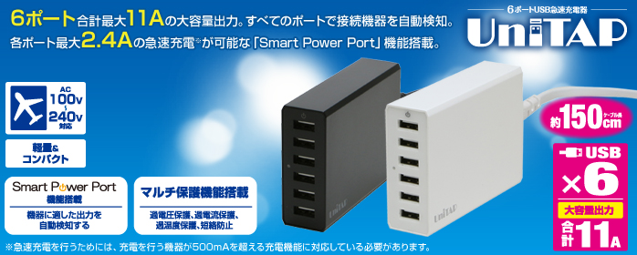 Smart Power Port機能搭載で6ポートで合計最大11Aの大容量出力が可能、内蔵ICが機器の必要電流量を自動検知し急速充電を行います。
