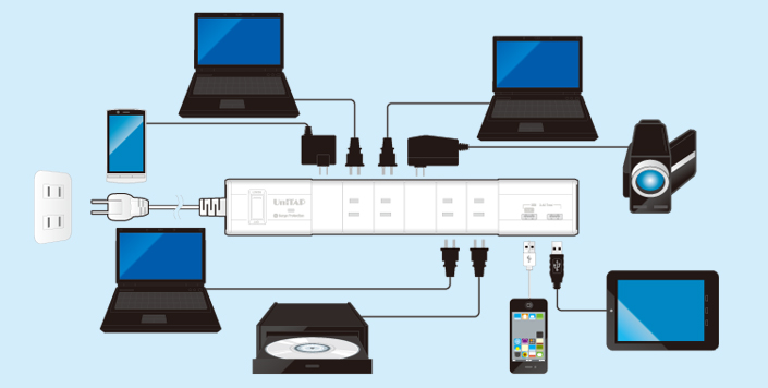 USB 2ポート、AC 6ポートの最大8台のデバイスへ同時に給電可能。PPS-UTAP6(Unitap)