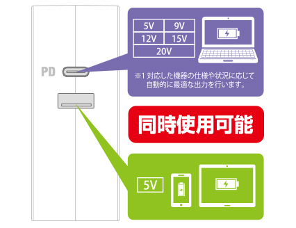 ※ 2: パワーデリバリーに対応した機器の仕様や状況に応じて自動的に最適な出力をおこないます。また、Type-Cケーブルは、メーカー純正ケーブルをご使用ください。