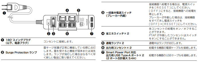本製品はPTAP(Proactive Thermal Advanced Protector =通電火災防止自動遮断装置)を搭載しています。コンセントが一定の温度に到達した時点で、火災が発生する前に対象の経路からの電流を自動的に遮断します。 PTAP は発火する前に電流を遮断することで、ご使用いただくお客様やご家族の生命、財産を守ります。