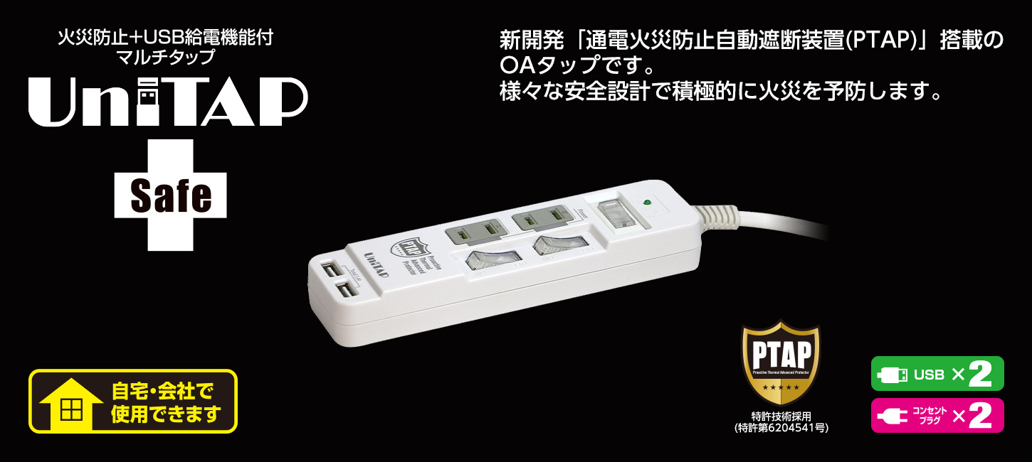 火災防止+USB給電機能付マルチタップ「Unitap Safe」