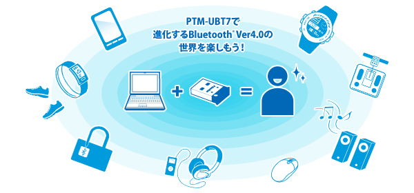 「PTM-UBT7」は、お手持ちのパソコンをBluetooth® Ver4.0対応パソコンとして使用できる、超小型、軽量タイプのBluetooth® USBアダプターです。お手持ちのパソコンに接続してドライバーをインストールすれば、Bluetooth® Ver4.0対応機器とつながる便利なネットワークを実現できます。
