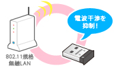 本製品と同じ2.4GHz帯の周波数を使用する、802.11規格の無線LANと併用した場合でも、電波干渉を抑えて安定した接続ができます。
