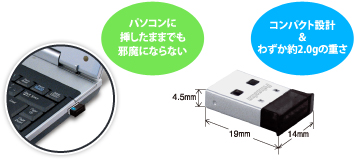 ※USBポートから電波送受信用のアンテナ部分がはみ出します。本機器を接続した状態でパソコン本体を移動する、収納するとパソコン本体または、本機器を破損する場合があります。移動または、収納する場合は、本機器を取り外すことをお勧めします。