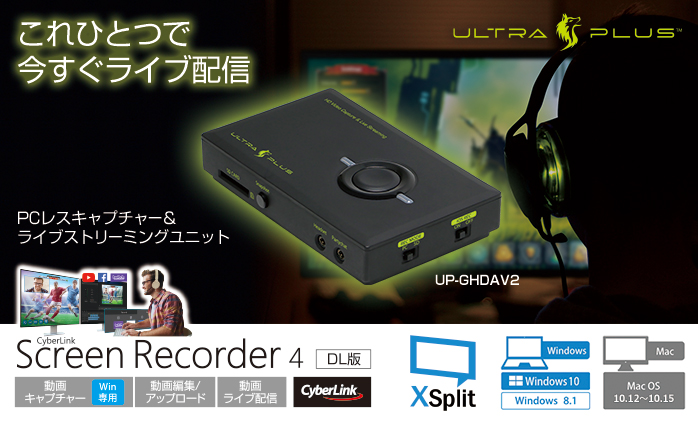 「UP-GHDAV2」はHDMI出力から動画の「キャプチャー(録画)」や「ライブ配信」が手軽にできるビデオキャプチャー+ライブストリーミングユニット