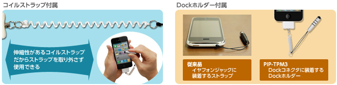 また、従来品のようにイヤフォンジャックに装着するタイプではなく、Dockコネクタに差し込んで装着するDockホルダータイプだから、ペンを装着したまま音楽を視聴できます。