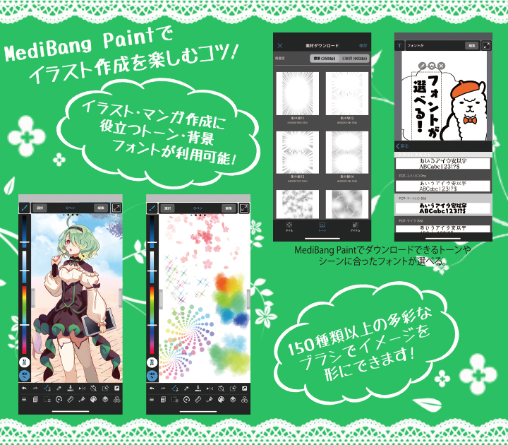 MediBang Paintを使用することでPASTEL SKETCHでも筆圧感知※のサポート、イラスト制作に便利な豊富な素材、有名フォント、多彩なブラシでより自由なイラスト制作をサポートします!※3D Touch対応のiPhoneのみ