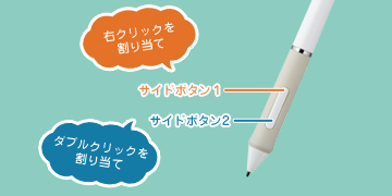 専用ペンには「サイドボタン」が搭載されています。このボタンは、ペンの操作を補助するもので、2つのボタンには「ダブルクリック」や「右クリック」など色々な機能を割り当てることができます。