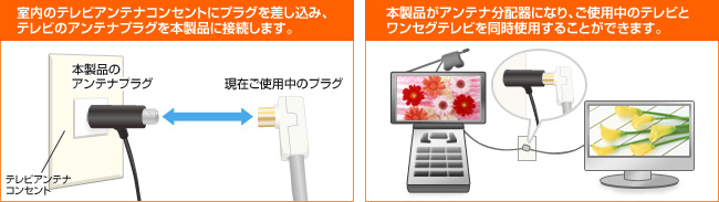 本製品は室内のテレビアンテナコンセントに接続する際、アンテナ分配器としても機能します。 本製品をテレビアンテナコンセントに接続し、ご使用中のプラグを本製品に接続することで、ご使用中のテレビとワンセグテレビを同時に使用することができます。
