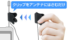 PEA-03M/PEA-05M/PEA-10Mはクリップをワンセグ対応携帯電話のアンテナに留めるだけの1STEP。とても簡単に装着できます。 見たい!と思ったときに装着するだけで、すぐに安定した映像受信が開始できます。