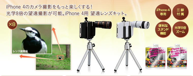 | 同梱品 | レンズ本体、レンズ保護キャップ、iPhone 4専用ケース、三脚、固定用ホルダー、ユーザーズガイド | ||