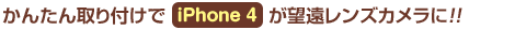 「PIP-CK4Z」は遠くの景色を8倍ズームで撮影できるiPhone 4用望遠レンズキットです。 光学式だからデジタルズームに比べて、クリアなズーム撮影が可能です。 取り付けはとてもかんたん。iPhone 4に装着したケースのレンズ穴にレンズを取り付けるだけですぐに使えます。 カメラアプリと併用すれば、楽しさもグンとアップします