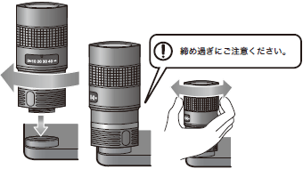 ケース正面のレンズ穴に、矢印の方向に回してレンズを取り付けます。 フォーカスリングをまわして、ピントを調整します。※3m以内の被写体は、レンズを外して撮影してください。※レンズをケースに強くねじ込み過ぎると、iPhone 4またはケースが破損する恐れがありますのでご注意ください。