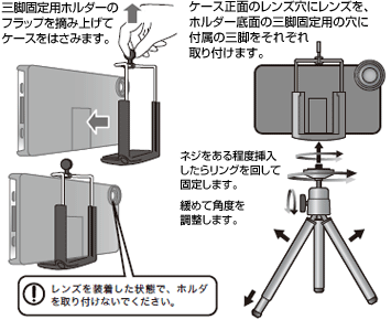 レンズやケース部を片手で持たないでください。ケースやレンズが外れてiPhoneが欠落する場合があります。 ケース左右を両手でしっかり持って撮影してください。