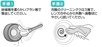 ※砂埃が残っている状態でレンズを拭くとレンズを傷つける原因となりますのでご注意ください。また、硬い布や軍手等でレンズを拭くとレンズに傷がつきます。 レンズを拭く際は必ず市販のクリーニングクロス等をお使いください。