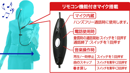 ケーブルには簡易リモコン機能付きマイクを搭載し、iPhone での音楽鑑賞、映像再生時にはリモコンとして、電話がかかってきた場合にはハンズフリーとして通話にご使用いただけます。※iPhoneの操作の一部はご利用いただけません。