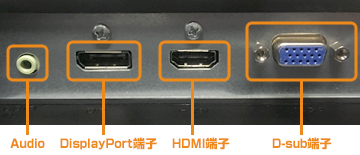 DisplayPort x1、HDMI x1、D-Sub x1の映像入力端子と、オーディオ入力 x1の音声用端子を備えています。