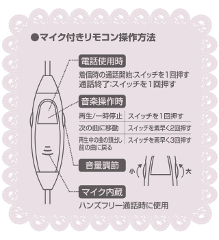 マルチファンクションボタンで、曲の再生・一時停止・スキップ・音量調整などの操作が可能。 マイク搭載でリスニング中に掛かってきた電話をとる事もできます。