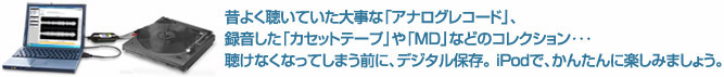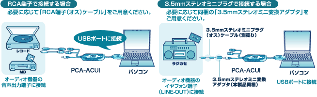 「PCA-ACUI」は、かんたんな操作で、オーディオ機器の音声をパソコンで録音・デジタルデータ保存、さらにインターネットラジオの再生/録音も可能なUSBオーディオキャプチャーユニットです。 ご利用のオーディオ機器と「PCA-ACUI」を接続し、お好みの音源をMP3、WAVに変換すれば、アナログのサウンドデータをiPodをはじめとするデジタルオーディオプレーヤーで楽しめます。 「PCA-ACUI」さえあれば、思い出のカセットテープやレコード、MDなどの大事な音源をデジタルデータでよりクリアに保存可能。 もう、大事なアナログ音源を繰り返し聴いて劣化させることもありません。