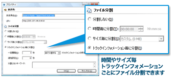 録音されたインターネットラジオファイルを、自動的に分割することが可能です。「トラックインフォメーション毎に分割」を選択すると、放送局側が配信する情報通りに、曲などを自動で分割しファイルを作成します。この他、「指定した時間」「ファイルサイズ」などでも分割が可能です。※インターネットラジオ放送局に配信される内容により、本機能をご利用できない場合があります。