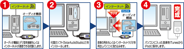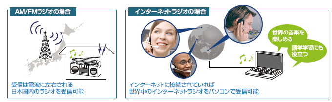 PCA-ACUI付属の「5star Audio Studio LE」は、アナログ音源のデジタル化だけでなく、インターネットラジオの再生や録音も可能です。 インターネットラジオは、専門局または個人がインターネットを通じて音声など配信するコンテンツのことで、世界中に1万局以上あると言われています。 「5star Audio Studio LE」で、インターネットに接続されている環境ならば、基本的に世界中どこでも、世界中の様々な国から発信されているインターネットラジオを簡単に楽しむことができます。