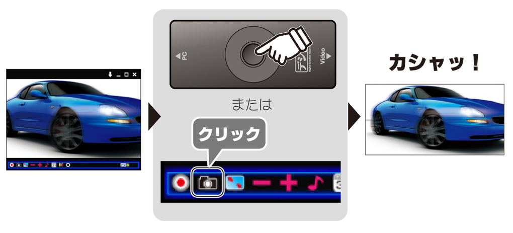 お気に入りの場面を"スナップショット"機能で静止画として保存できます。本体のスナップショットボタン、またはウィンドウのスナップショットアイコンをクリックして撮影できます。連続撮影も可能なので、残したい一瞬を逃しません。