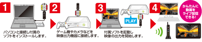 かんたん接続&操作で、ゲーム映像などのライブ映像を配信・録画したり、撮りためたアナログ映像を手軽にデジタル化できます。