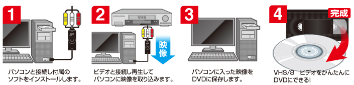 接続や保存方法はとても「かんたん」。4つの工程でVHSや8mmビデオをデジタル化できます。