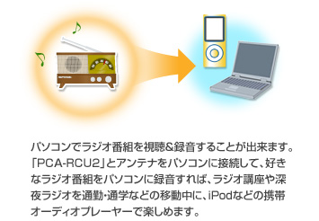 セットアップ方法はとってもかんたん。付属の専用ソフトウェア「デジ造RadioPlayer2」をインストールしたパソコンに、「PCA-RCU2」と付属のアンテナを接続し、かんたんな設定を行うだけ。パソコン初心者でもセットアップが可能です。