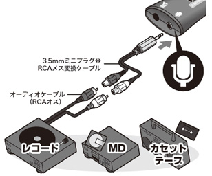 ステレオ入力ケーブル(3.5mmミニプラグ⇔RCA)が付属しています。付属のケーブルで本製品とオーディオ機器を接続すれば録音可能となります。