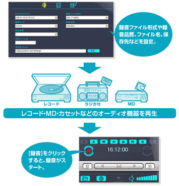 アナログ音源を録音する際は、ファイル形式(AAC、WMA、WAV)を選択できますので、お持ちの携帯オーディオプレーヤーに合わせて保存することが可能です。