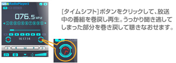 放送を聞いている途中に[タイムシフト]をクリックすると、聴いているラジオ番組をリアルタイムで最大60分程度巻戻して聴くことができます。"肝心な部分を聞き逃してしまった!"そんなときに便利な機能です。