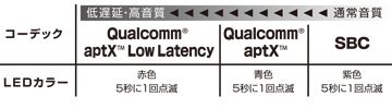 | 対応コーデック | SBC/Qualcomm® aptX™/Qualcomm® aptX™ Low Latency |