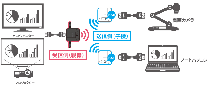 映像信号をワイヤレスで伝送して接続する機器をボタンで切り替えることができるワイヤレスプレゼンテーション。