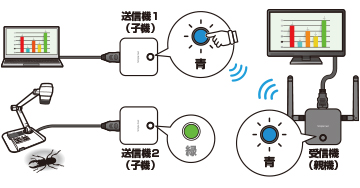 送信したい子機のボタンが「緑」に点灯している時にボタンを押すと「子機」と「親機」のボタンが「青」に点灯し映像が投影されます。